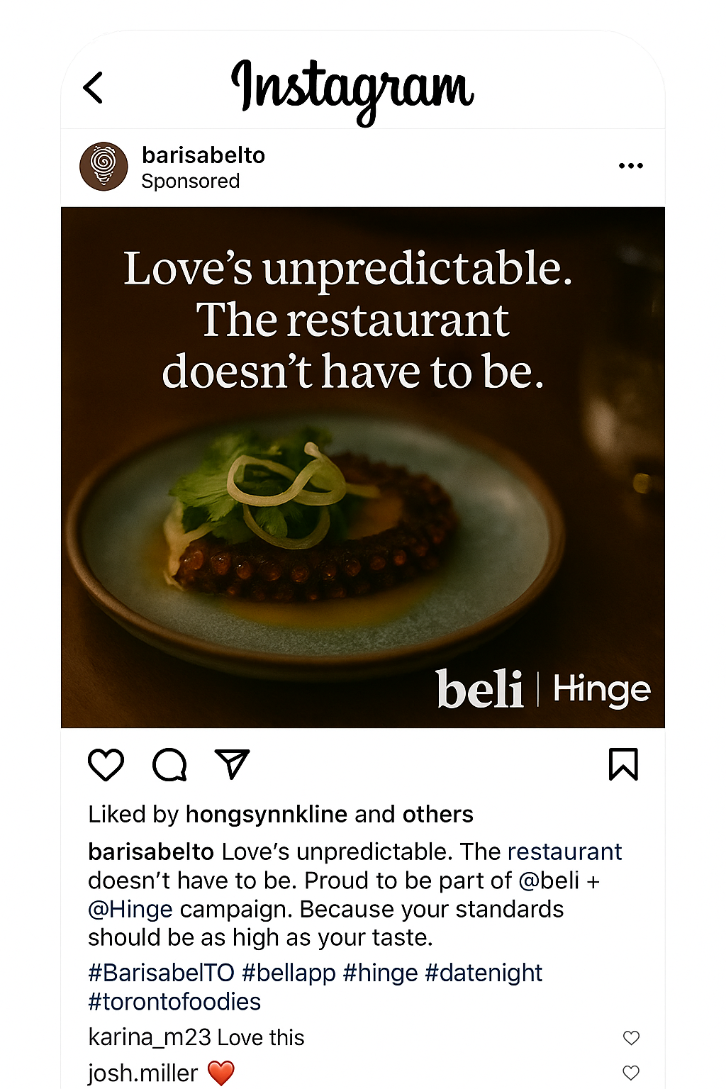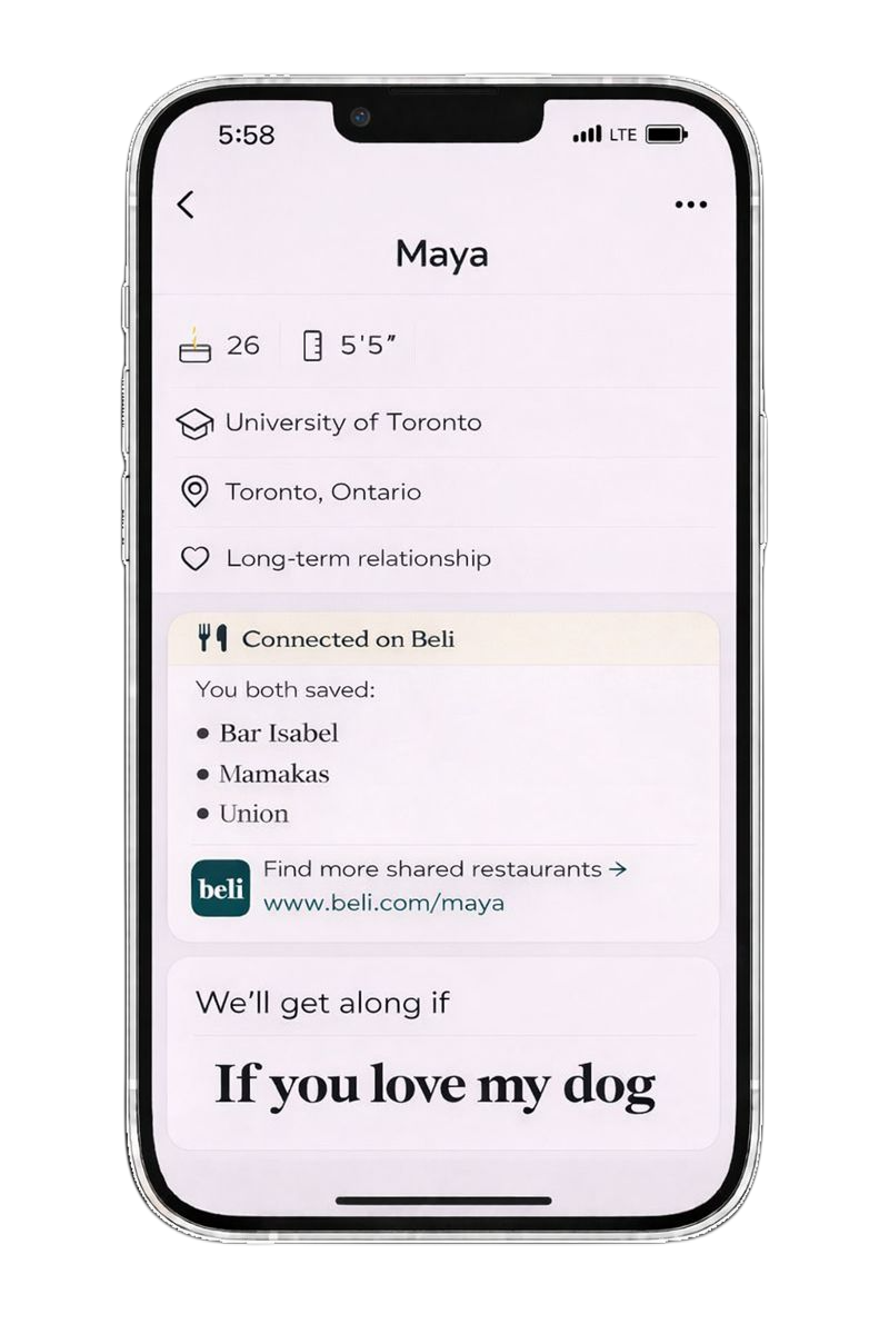 Taste Match. When Hinge came to us looking for a partner, we matched them up with Beli. Giving Hinge users better, tastier dates. The Cheat Code The Cheat Code The Cheat Code Access Beli directly from the Hinge user Profile. By connecting diners through their top restaurant picks, the collab turns shared taste into the perfect first step toward chemistry. SHARED TASTE. #TastematchTurning real dinners into social moments for Hinge × Beli. Slide 1 Slide 1 (current slide) Slide 2 Slide 2 (current slide) Slide 3 Slide 3 (current slide)